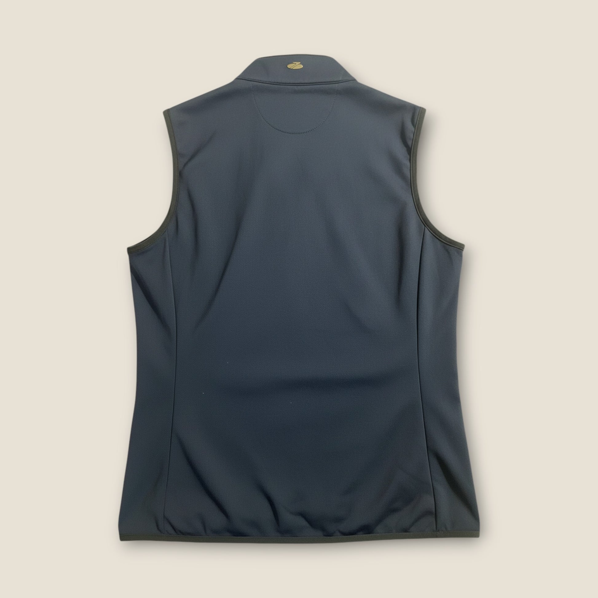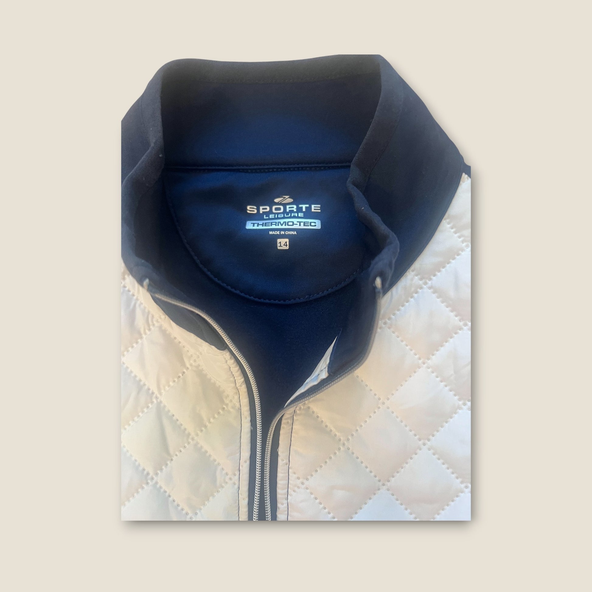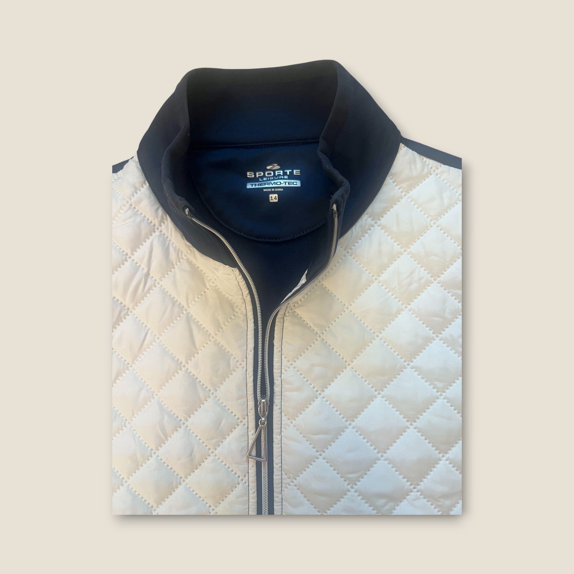A sleek navy Sporte Leisure Thermo-Tec™ full-zip vest designed for warmth without bulk. Featuring a self-fabric collar with a high neck, this piece includes a lightly padded white front chest panel for added insulation and contrast detail.